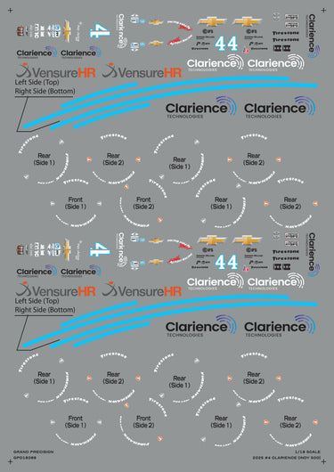 Waterslide Decals designed specifically to convert the IXO or Greenlight 1/18 scale Dallara Aeroscreen speedway diecast to David Malukas's #4 Clarience Technologies car from the 2025 Indianapolis 500.