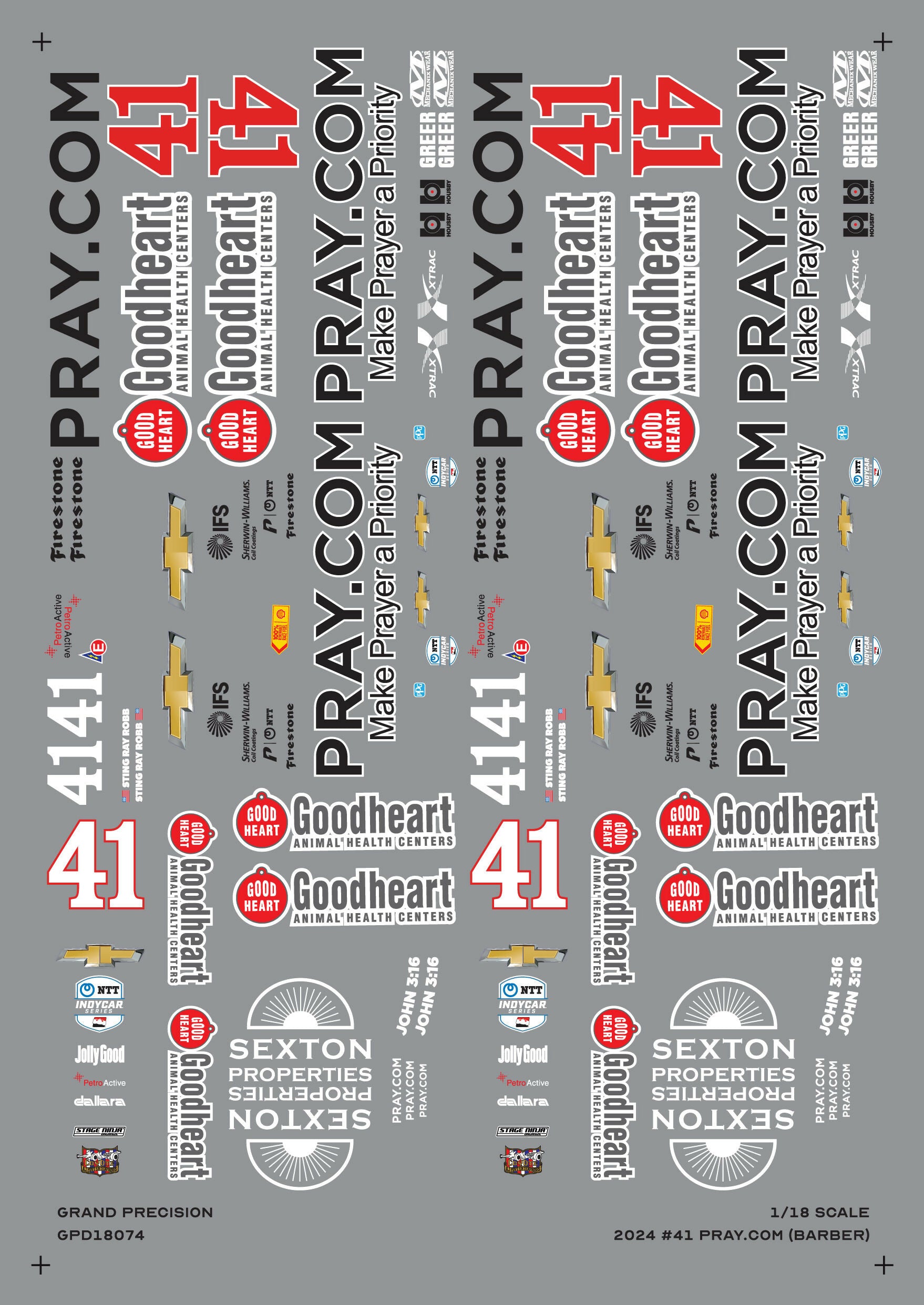 Waterslide Decals designed specifically to convert the Greenlight 1/18 scale Dallara Aeroscreen road course diecast to Sting Ray Robb's #41 Pray.com car from the 2024 Barber Indycar race.