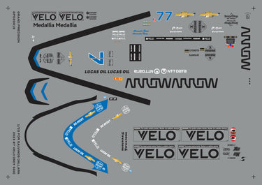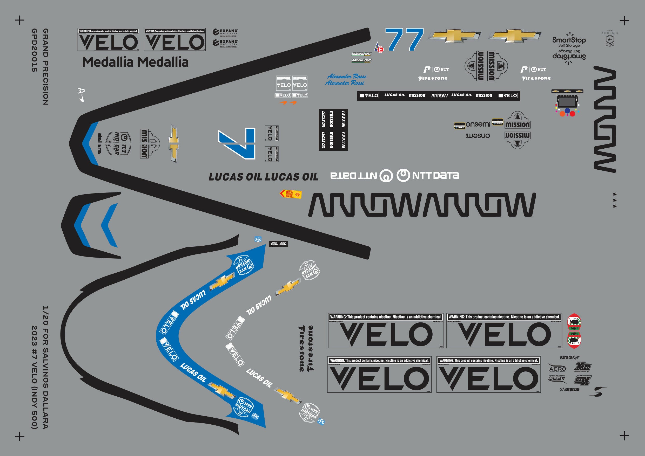 Waterslide Decals designed specifically to convert the Salvino's JR 1/20 scale Dallara Aeroscreen model kit to the 2023 Mclaren #7 of Alexander Rossi from the Indy 500.
